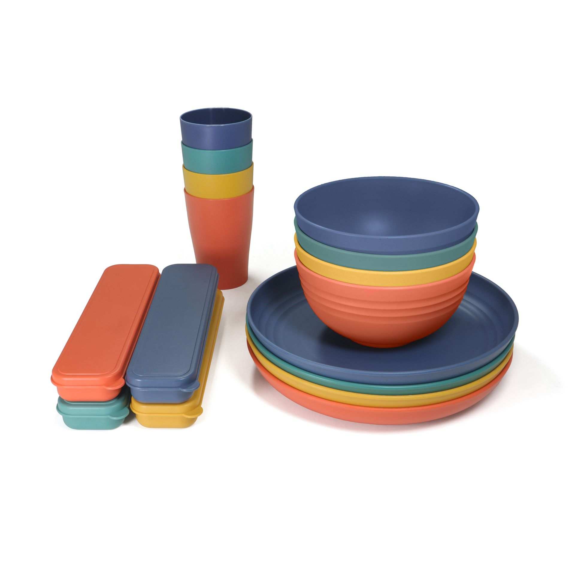 Das 28-teiliges Geschirrset aus robustem Kunststoff ist die perfekte Ausstattung für 4 Personen. Es umfasst alles, was Sie für eine komplette Mahlzeit benötigen: Teller, Schüsseln, Becher sowie eine praktische Besteckbox mit Gabeln, Messern und Löffeln. Die glatten Oberflächen lassen sich besonders leicht reinigen. Das Set ist stapelbar und besonders leicht, wodurch es sich hervorragend platzsparend verstauen und transportieren lässt. Somit ist es optimal für kleine Schränke, Rucksäcke oder Campingboxen geeignet.