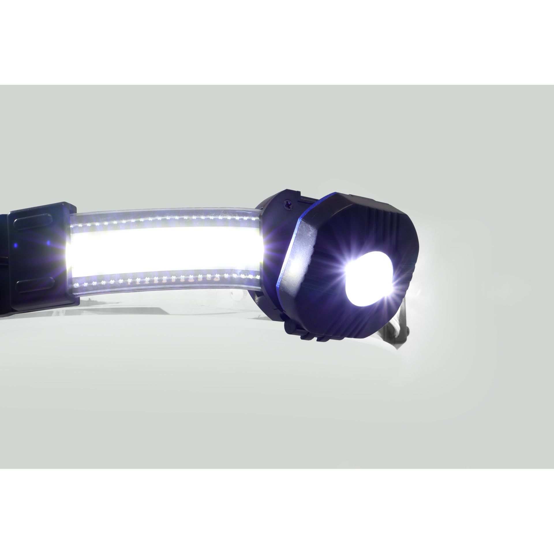 Leichte und leistungsstarke LED-Stirnlampe mit integriertem Rücklicht und seitlichen LED-Streifen für eine besonders breite Ausleuchtung von ca. 210°. Front- und Rücklicht lassen sich separat bedienen und flexibel anpassen.