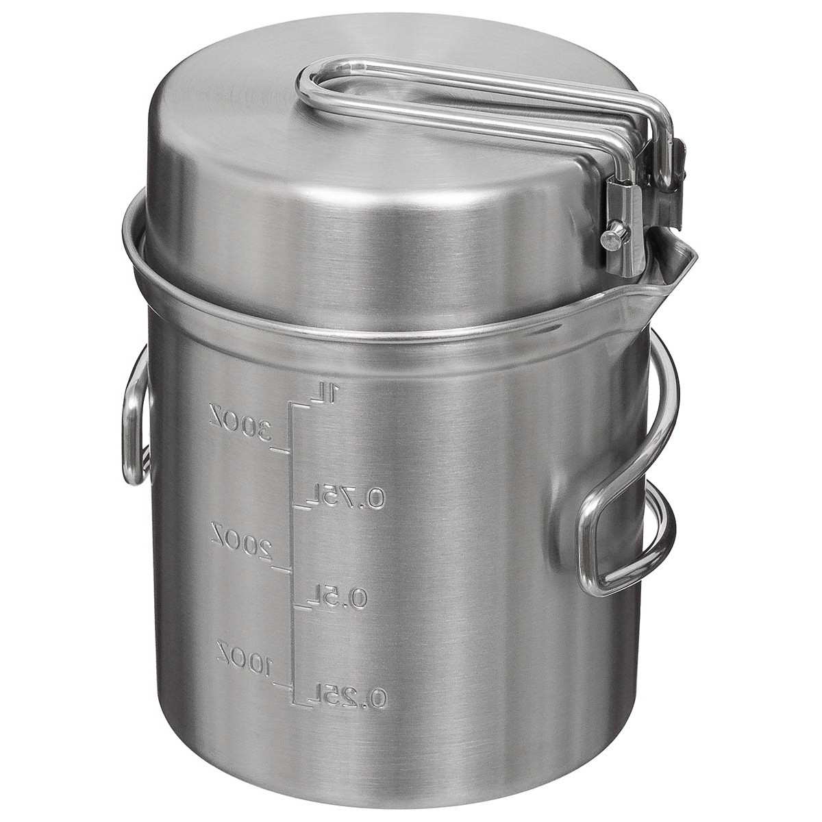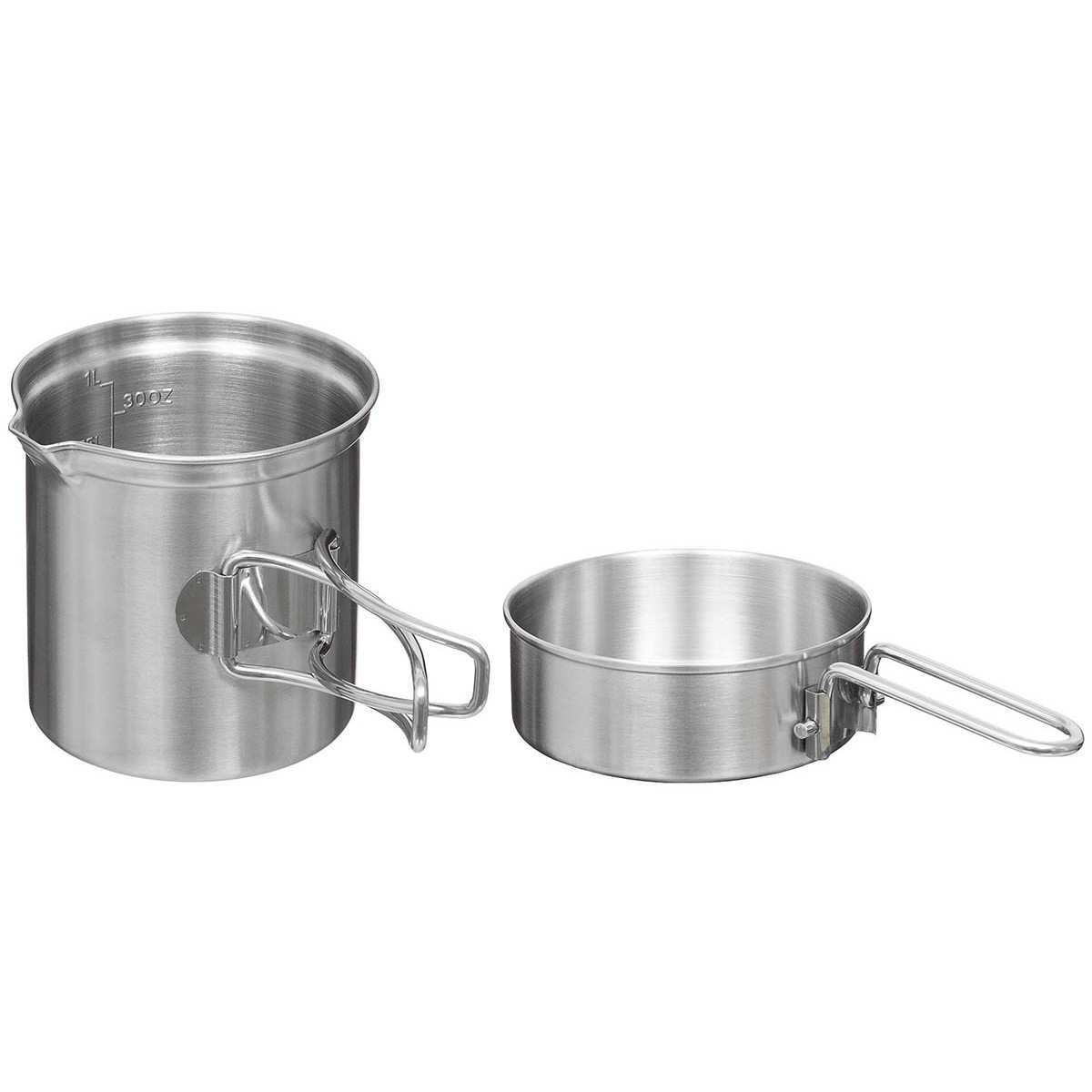 Topf und Pfanne Das Edelstahl Kochgeschirr-Set ist ideal für Minimalisten, Trekkingtouren und Solo-Camping. Es besteht aus einem Topf und einer Pfanne, die platzsparend ineinander verstaut werden können. Robuster Edelstahl sorgt für Langlebigkeit und einfache Reinigung.