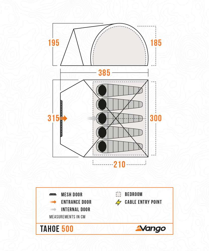 Das ** Campingzelt Vango Tahoe 500** ist ein geräumiges und vielseitiges 5-Personen-Zelt für Camping, Festivals und Wochenendtrips. Die stabile 3-Stangen-Konstruktion kombiniert mit einem großen Vorraum inklusive integrierter Bodenplane bietet viel Platz für Ausrüstung und zuverlässigen Schutz bei jedem Wetter.