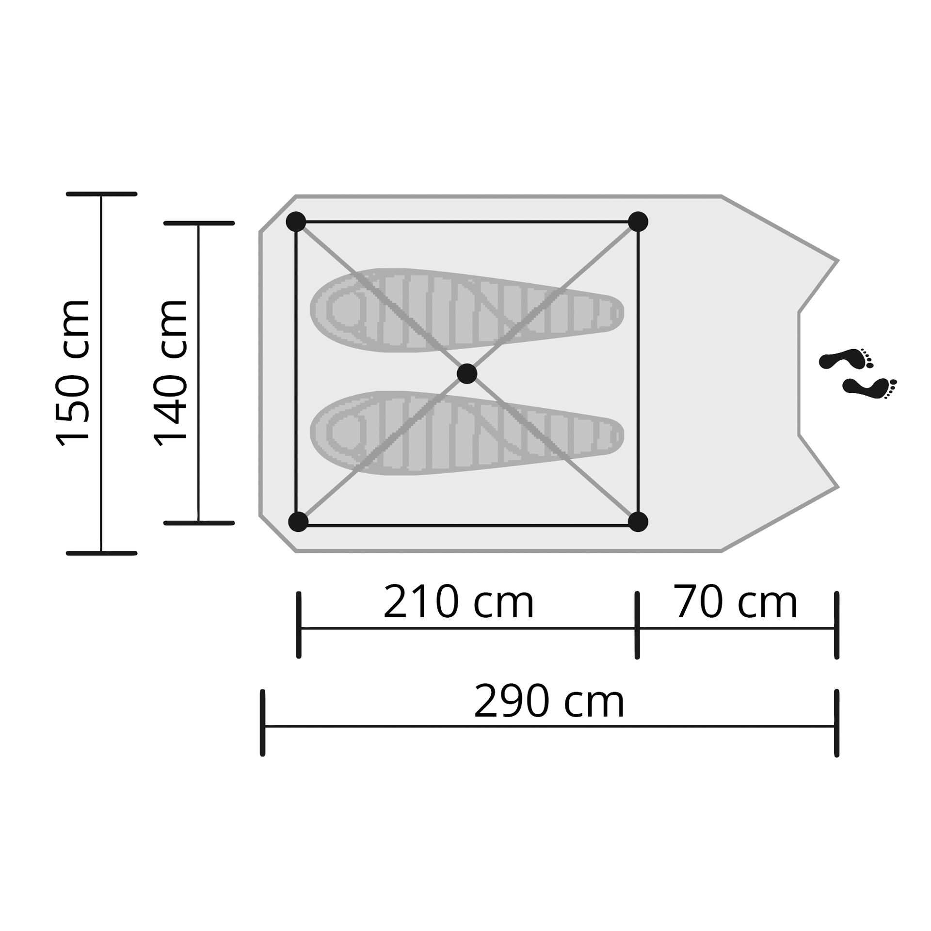 - Wassersäule: 3.000 mm (Zelt), 5.000 mm (Boden)